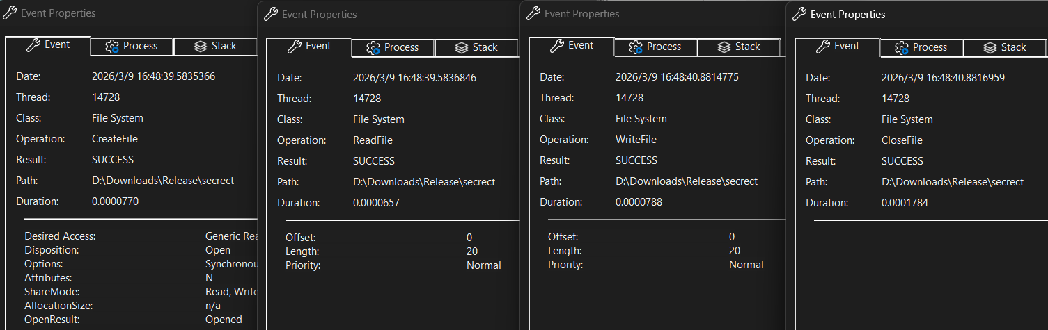 突发奇想,用 Process Monitor 对进程监控,有了收获(下图是创建了随机文本文件 secrect 的结果,否则在第一步 NAME_NOT_FOUND):