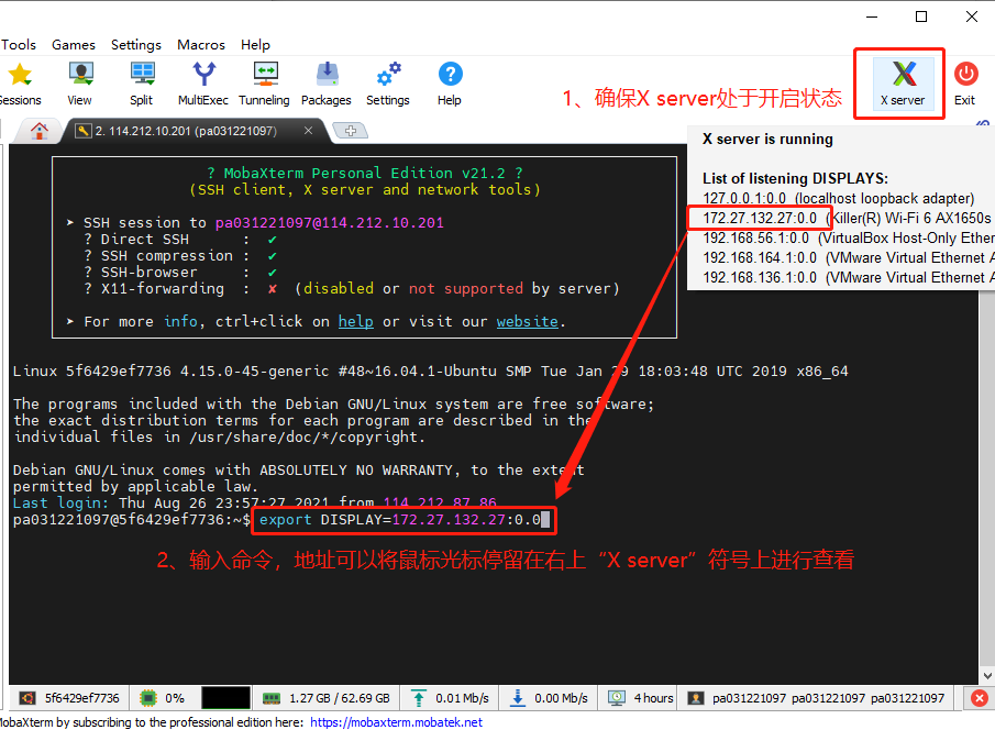 通过 MobaXterm SSH 连接远程服务器,勾选 X11-Forwarding,连接到远程服务器后设置 DISPLAY 变量,命令行输入