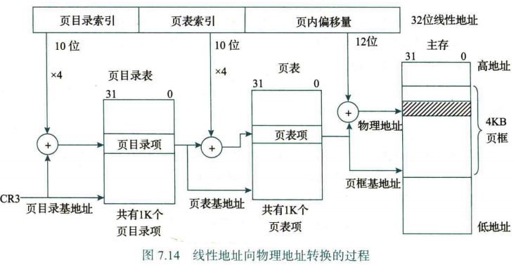 首先通过 CR3 的 pdbr 位获取页目录的物理基地址,加上页目录索引得到对应的页目录项地址;页目录项存储了对应页表的物理基地址,加上页表索引得到对应的页表项地址;页表项存储了对应页框的物理基地址,加上页内偏移量得到对应的主存地址