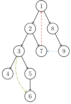 - Back edge, which goes from child node to ancestor node.