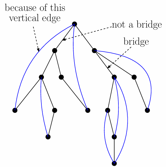 Given \(G = (V,E)\), \(e ∈E\) is called a bridge if the removal of \(e\) from \(G\) will increase its number of connected components.