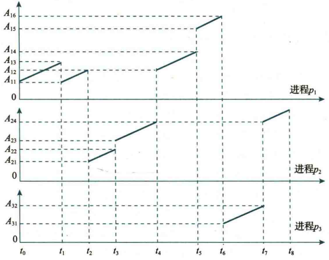 我们定义连续执行同一个进程的时间段为时间片(参考上图中的每一个处于同一进程的 \(t_n\sim t_{n+1}\) 时间段,比如 \(t_0 \sim t_2\))