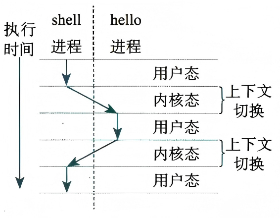 上下文切换是操作系统保存当前进程的状态,并恢复另一个进程状态的过程,目的是实现并发效果。下图表示的就是通过 shell 运行 hello 程序时,hello 程序和 shell 程序的系统上下文切换