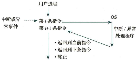 CPU 在执行完第 \(i\) 条指令时检测到异常,或者在执行完第 \(i\) 条指令后收到中断,就会停下当前用户进程,转到相应的异常 / 中断处理程序去执行。具体的操作如图