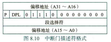 任务门描述符只包含 TSS 段选择符,指向 GDT 的 TSS 段描述符,此处略