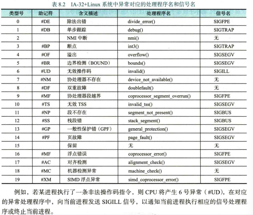 IA-32/x86-64 对中断 / 异常类型的识别采用硬件方式。每个异常/中断有唯一类型号(称为中断类型号),其中前 32 个中断类型为处理器保留值,后面的类型可以由操作系统定义。