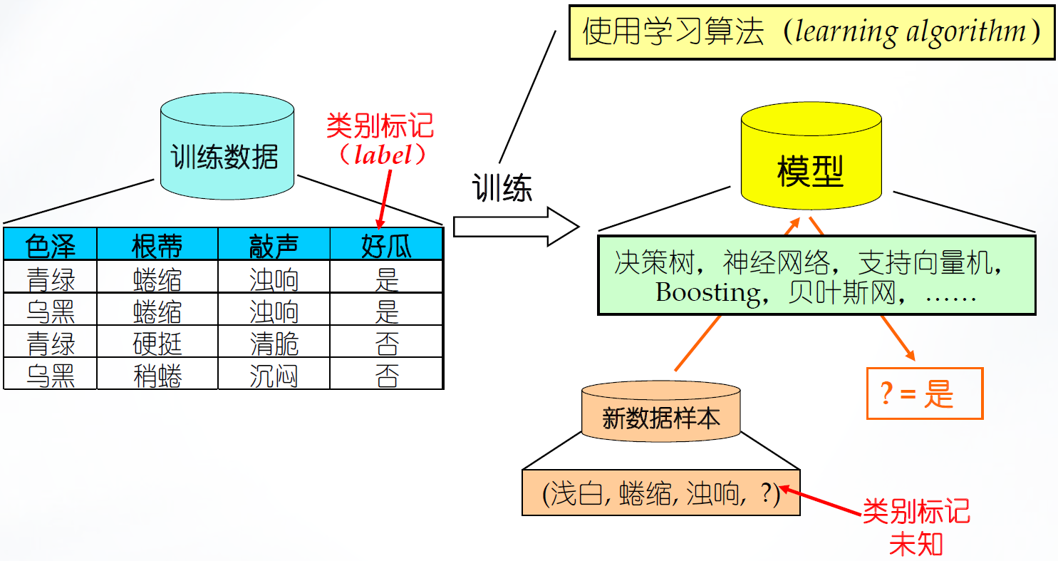 - 学习/训练:从数据中学得模型的过程。