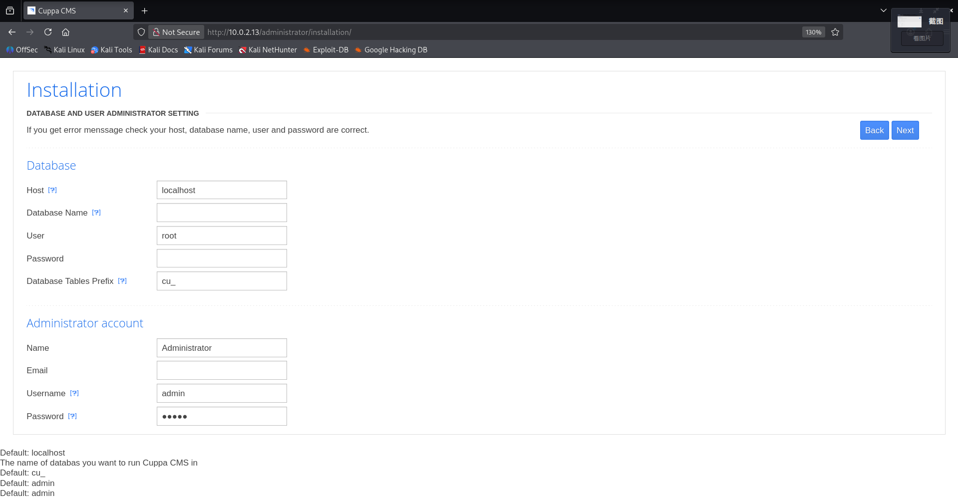 进入了 http://10.0.2.13:80/administrator/installation