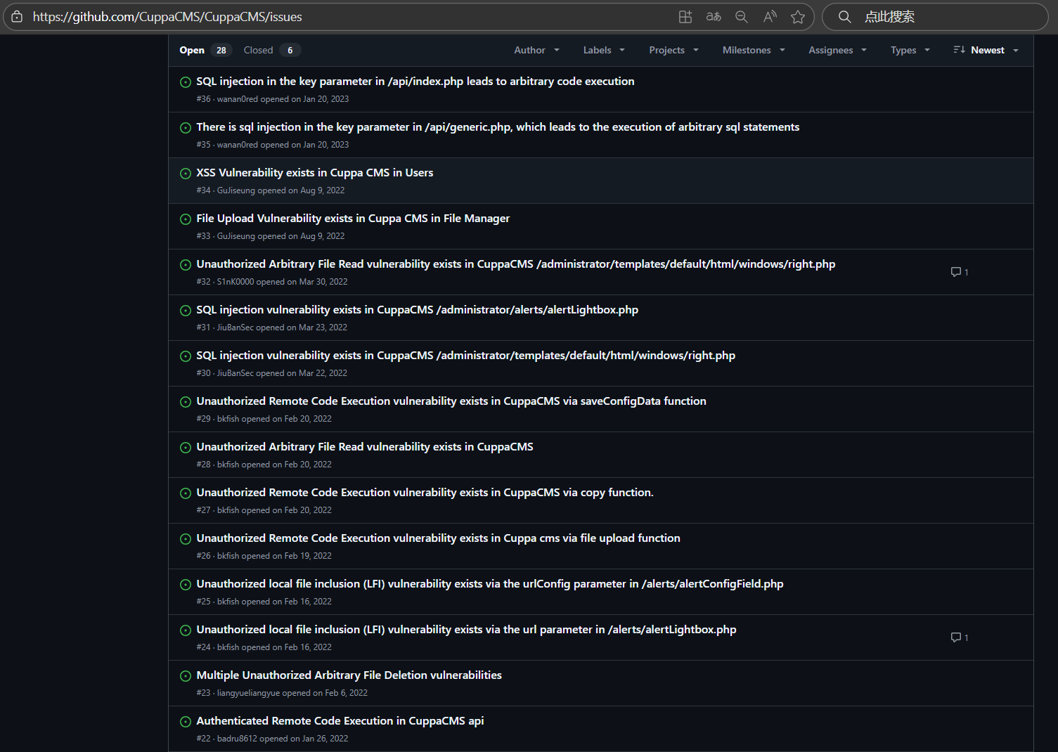 似乎没有头绪了,偶然发现页面 Title Cuppa CMS,在 Github 上搜一下,发现是真实存在的项目,而且似乎有 SQL 注入,文件上传导致远程代码执行,XSS 攻击等各种 Bug