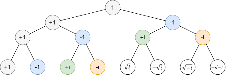 现在我们将对 \(p(x)\) 与 \(p(-x)\) 的计算转换成了两个新的问题:如何计算 \(E(x^{2}), O(x^{2})\)?比较显然的,如果 \(x\) 是 \(2^{k}\) 次单位根,则 \(x^{2}\) 是 \(2^{k-1}\) 次单位根。因此,我们可以继续分解问题,这个计算过程最终成为了一个递归的树结构(或者说,分治操作)