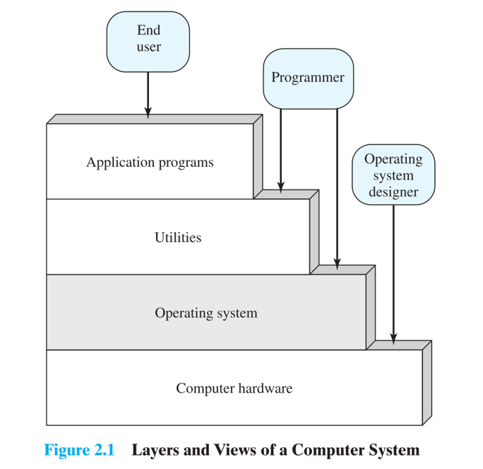 操作系统是介于用户界面和硬件层之间的,处于内核态下的程序。一方面,操作系统自顶向下为应用开发人员提供简洁易用的资源抽象(系统调用服务);另一方面,自底向上管理种类繁多、纷繁复杂的硬件资源(支撑软件层和用户层都通过操作系统接口使用资源)