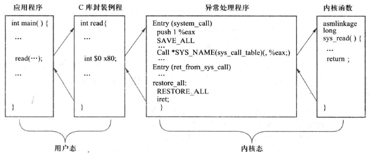 read(),实际上调用的是 glibc 库提供的包装函数 read()函数构造相关参数,调用int 0x80触发软中断,进入内核态- 系统调用号存入